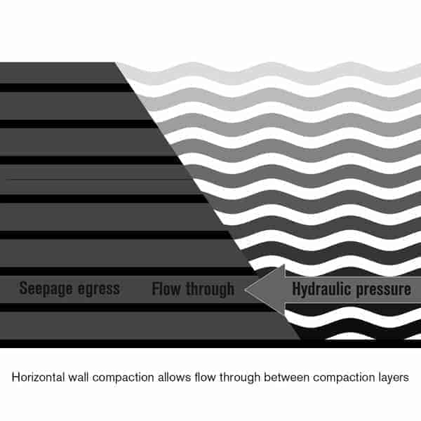 Flat layers of compaction allow the water to exit the dam by travelling laterally through the dam wall interior between the compaction layers – much like honey drips out of pancakes