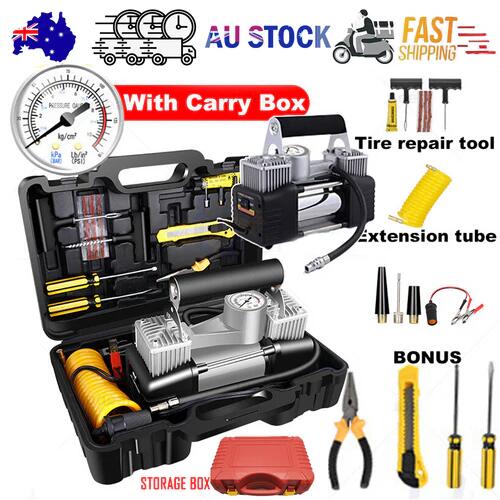 Packaged included:1x Air Compressor With 3m Cable1x 0.5m Air Hose1x 1.5m Coiled Hose1x Battery Clamps pair3x Nozzle Adaptors1x Red Storage Box1x Tire Repair Tool SetDescription:Inflating tyres is a breeze with this 12V air compressor! It is ideal for inflating many types of tyres including 4WD vehicles and tractors tyres. This lightweight mini compressor is small, compact and portable for easy storage in most vehicle types. With Larger double cylinder for extra power, it can reach to the nomal tire pressure quickly. It is really a must have accessory for caravan trips or off-roading adventures!Features:1. Heavy duty air compressor, ideal for inflating many types of tyres including 4WD vehicles and tractors tyres.2. Huge air flow twin cylinder 150PSI working pressure, can reach to the normal tire pressure quickly.3. This lightweight mini compressor is small, compact and portable for easy storage in most vehicle types.4. Cast metal air pump casing with radiator for better heat dissipation.5. Supplied with tyre inflator extension adapter and other inflation accessories in the carry bag.6. Able to inflate bike tyres, car tyres, athletic balls etc. Specifications:Material: MetalColor: Black SilverVoltage: 12V DCCurrent: 14AMax. PSI: 150 PSIContinuous Working Time: 20 minCable Length: 3mAir Hose Length(Black): 0.5mCoiled Air Hose Length(Yellow): 1.5mPump Size(approx.): 21.5 x 8.5 x 20cmNote:1.Don’t use this item with 24V, 36V, 110V and 220V electric sources, just use with DC 12V 14A electric sources.2.We suggest the using time should not be over 10 Minutes, if more than 10 Minutes, please turn off the product and cool it to 10 minutes before use again.3.Please allow minor deviation due to manual measurement.NOTE:PO BOX address is not supported, please provide the correct physical addressATTENTION:If the customer change their mind and want to cancel the order, please contact us within 2-3 hours after placing the order. Or, once the package is dispatched, we wont be able to intercept packages in transit. Please understand.Refund note: Only return the product cost, not refund the freight!!!Tip:Due to the high freight costs in some areas, there may be additional charges. Thank you for your understanding.
