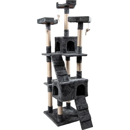 Your cats love places to hide, places to play, and places to sharpen their claws for their next conquest, be it a mouse or a favourite toy. With this deluxe cat condo and treehouse by Randy Travis Machinery, your cats will have the best of all worlds. This luxurious tower features perches on which they can watch the world, cubby holes in which they can hide for a snooze, and lush sisal wrapped around scratching poles, giving Kitty the best of all worlds.Platforms set at a variety of heights entice your cat to hop, jump, and pounce, while the cubby holes give your cats the sense of security they crave. Keep your cat active and healthy while giving him an alternative to your furniture and carpet and yet keep his claws strong and healthy.Crafted from natural sisal and E1 standard board, this huge cat condo is completely eco-friendly yet durable built to last. Its plush velvet upholstery pampers your cat like the royal pet she is even as its neutral timber and sisal material blend in with your home’s other furnishings.Features and specifications:Material: Fir timber, natural sisal, and plush velvetDimensions: 50 x 50 x 170 cm (L x W x H)Accessories: Assembly kit and assembly manualDurable constructionEco-friendly materialsMultiple levels and activities to prevent boredomRamps for easy access, even for senior catsProvides cats with an alternative to furniture and carpet to sharpen their clawsNote: COM (change of mind) Return Policy: The product must be unopened and in brand new condition, with the return to be organised by the customer. Once received and verified to be in the condition specified, refund is only of the item value minus 15% restocking fee (not including initial shipping). An additional return charge, which is same cost as that of initial shipping, will be deducted from the refund on returns due to delivery failure caused by customer error. For the health and safety of our staff and other customers, we are unable to accept returns of personal use items.