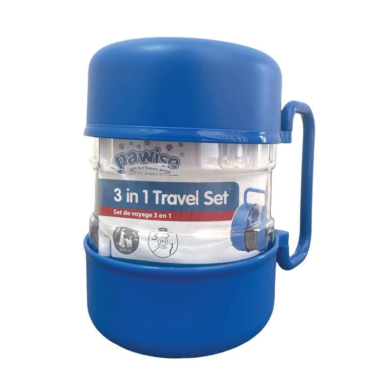 Pawise 3 in 1 Travel Set is the ideal and practical feeder and drinker for pets on the go. The set functions as a portable dispensing container to store food or water, with two bowls to serve your furry friend meals when touring, travelling or away from home.Features:Feeder container with two bowls included, functioning as a feeder and drinkerEasy to carry with secure handleScrew top lid closes tightly, ensuring food freshnessSuitable for wet, dry or soft croquettesControl food proportionsErgonomic, compact designSpecifications:Model: 3 in 1 Travel Set11064Material: Food Safe PlasticColour: Transparent, BlueSize (cm): 16.5 (H) x 12 (L)Food Container capacity: 2LBowl Capacity: 750mlPackage Includes:Pawise 3 In 1 Travel Set