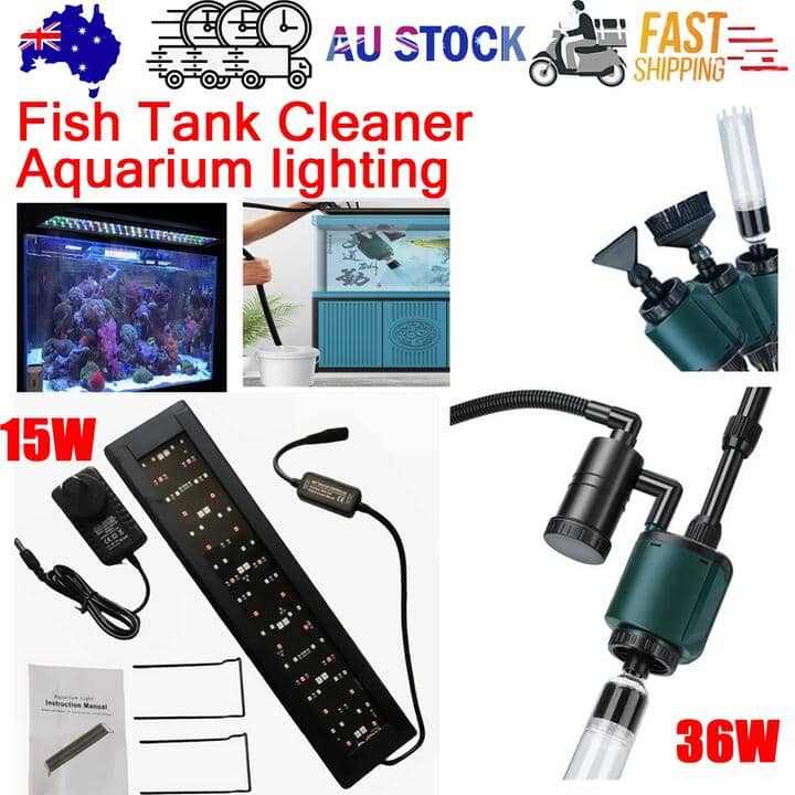 FEATURE:Fish Tank Cleaner 100% Brand new ang high quality.Adjuatable height. Suitable for both shallow and deep aquarium. Meet you different need.7 in 1 design. You can remove the dirt from the bottom of your aquarium and you also can exchange the water in the fish tank. 36W strong sution. Easily removes particles from topmost layer of substrate without disturbing the bottom layer of gravel.Easily fixate the power cord in extension tube.Convenient to use. Press the on/off button, the water in aquarium will be pumped out automatically through a hose for changing water.Easy to install. Please refer to the user manual.SPECIFICATION:Type: Aquarium Fish Tank CleanerColor: Black+BlueFilter: Filter CottonPower: 36WVoltage: AC 220-240V/50HzFlow Rate: 2000L/h40cm Aquarium Housing 66LED RGBW 15W Waterproof Stand Light Full Spectrum 13 Colors with 2 Adjustable Stand 1 Timer Controller for 40-60 cm Aqua Fish Tank? 66LED RGBW 13 Colors: Full Spectrum Lighting is more suitable for Freshwater and Saltwater aquatic plants;?Adjustable bracket at both ends: Extendable Adjustable bracket makes LED light fits different size aquariums in extendable range;?Independent LED light: If one of the LEDs is not working by being misused, the others would not be affected (But other cheaper ones will be extinguished lots of LEDs and can’t be used any more);?Energy saving and durability: High efficiency, low energy dissipation, save cost, extend LEDs life span, much durable than those lights made of plastic;?Recommend 40-60 cm Fish Tank: Please choose light with suitable length for your nano tank to achieve good effect, Full Spectrum Lighting is more suitable for Freshwater and Saltwater aquatic plants.13 Color Light Specifics:The Five Generation of RGBW Aquarium LightsUltra Bright 2835 RGB LEDHigh Quality Color Changing RGB LEDINPUT:DC5-24VOUTPUT:DC5-24VOUTPUT CURRET:MAX 6AFull Spectrum Lighting is more suitable for Freshwater and Saltwater aquatic plants.Four timing modes of 3/6/9/12hours:For exampleAt 10:00am today, timing 3 hours, the light will turn off after 1:00pmAt 10:00am tomorrow, the light turn on and work 3hours,will turn off after1:00pm,Continuous circulation(Note that power cannot be cut off during timing)PACKAGE INCLUDED:Fish Tank Cleaner set:1x water pump1x handle and extension tube1x dirt suction head with scraper1x Anti-sand suction head1x bellows1x hair brush1xSand Washer1x filter cup1 X AdaptorAquarium Light set:1 x 40cm Aquarium Light2 x Extendable Brackets1 x DC 12V Power Adapter1 x User ManualNOTE:PO BOX address is not supported, please provide the correct physical addressATTENTION:If the customer change their mind and want to cancel the order, please contact us within 2-3 hours after placing the order. Or, once the package is dispatched, we wont be able to intercept packages in transit. Please understand.Refund note: Only return the product cost, not refund the freight!!!Tip:Due to the high freight costs in some areas, there may be additional charges. Thank you for your understanding.