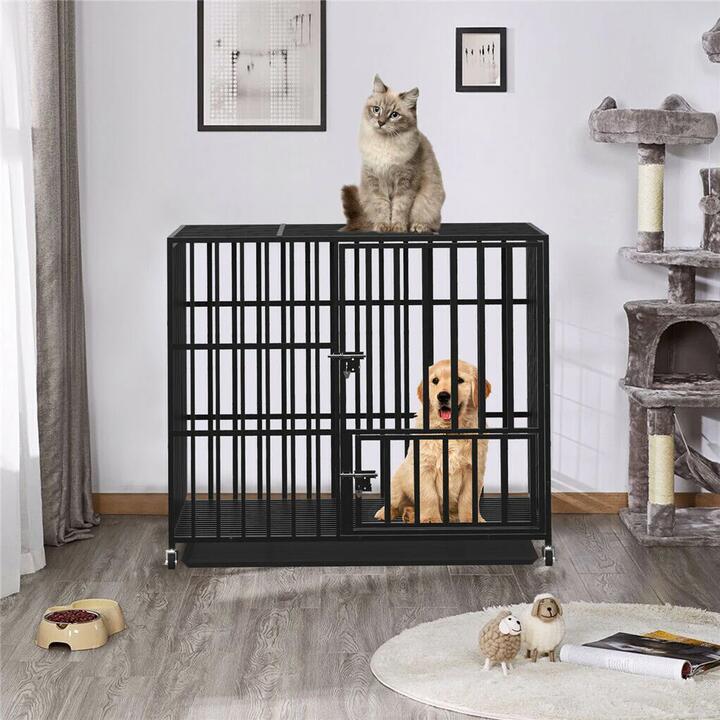 42 XL Heavy Duty Dog Cage Playpen Kennel w/ WheelsThis item stands out for the following characteristics:Enhanced Durability: Constructed with 20-gauge steel and reinforced with 5cm diameter steel tubes, this jumbo XL dog cage is designed to withstand the strength of powerful and aggressive dogs, ensuring a secure and robust enclosure.Ease of Mobility: Equipped with four 360-degree rolling casters, this heavy-duty pet playpen can be effortlessly moved around your home or locked in place, providing convenience without compromising stability.Dual Access Doors: Features a practical double door design that allows for easy entry and exit, enhancing interaction and simplifying feeding, making it a comfortable and accessible space for large dogs.Safe and Versatile: Finished with a multi-layer, non-toxic hammer-tone green coating that is rust and corrosion-resistant, this portable dog cage is safe for your pet and suitable for both indoor and outdoor use, maintaining its condition over time.Key features:Item Dimensions: 30 x 30 x 20 cm.Item weight: 3 kg. Package Dimensions: 32 x 32 x 22 cm.Package weight: 3 kg. The box includes the product and all its components and a simple instruction set. One product for package.