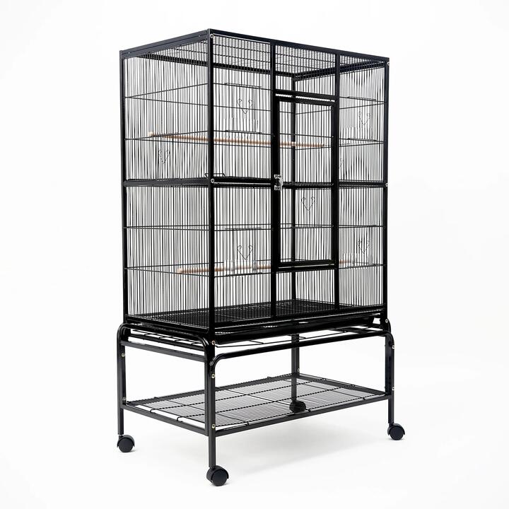 Paw Mate Bird Cage Parrot Aviary Melody 137cmThis stylish and practical Home Ready Heavy Duty Large Bird Cage with Wheels is the perfect solution for you if you need somewhere comfortable and safe for your loved bird to stay in. The cage suits small to medium sized birds (parrots, budgies etc.) It is made with high-quality materials, easily movable and very easy to assemble.The cage’s frame is made of durable and high-quality wrought iron and it is powder coated in order to prevent it from rusting and offer a longer service life. There is one lockable door so you can keep your bird safe and have easy access inside the cage. There is also a removable tray under in order to make cleaning easy. There are four, 360 degree swivel caster plastic wheels so relocating the birdcage is very easy. 4 plastic water/food container and 2 rest wooden perches are included. The cage also has a clever shelf under it so you can store your birds’ needs, such as water, food and cleaning tools.Come grab one of this great bird cages and enjoy their beautiful singing sound!Product Features:Made of quality wrought iron and powder coated to extend durabilityLarge centre access doors with secure locks to keep your birds safeLockable top of dome doors can be opened to display your birdsSlide out removable bottom tray for easy cleaningFitted with 2 wooden perches4 food/water bowlsBottom shelf for extra storage in order to save space4 plastic caster wheels provide maximum mobilityCage part can be separated from bottom partEasy to assembleProduct Included:1x Pet Bird Aviary1x Assembly GuideProduct Specification:Brand: Paw MateMaterial: Powder Coated Wrought IronColour: BlackBar Spacing: Approx. 13mmDimensions: 137cm(H) x 84cm(L) x 54cm(W)Weight: 18.5kg
