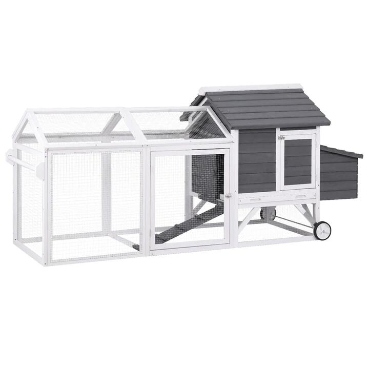 The i.Pet Chicken Coop, designed with a hatching box for easy egg collection and two wheels for portability, offers a secure and convenient home for your chickens. Crafted for durability and weather resistance, it ensures comfort and mobility.FeaturesSpacious enclosed play area with integrated foldable rampHatching box for egg collectionPortable design with two wheelsDurable fir wood constructionWeather resistantSloped wooden roofSecure galvanised mesh and latches to keep animal safeSlide out tray for simple cleaningEasy assemblySpecifications:Frame material: Fir WoodMesh material: Powder-coated wireOverall dimensions: 225cm X 80.5cm X 105cmColour: Grey and whiteAssembly required: YesNo. of packages: 2Package Contenti.Pet Chicken Coopx 1AssemblyManualx 1This product comes with 1 year warranty