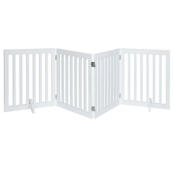 FREESTANDING INDOOR DOG GATEA free standing indoor dog gate helps to keep dogs and children safe.Even the best dog owner has tripped on their pup. Maybe a laundry basket got in the way or their leash got tangled around your ankles like a bola. No matter why it happened, you probably spent the next half an hour apologizing and trying to kiss your dogs boo-boos better. When you have a smaller dog, even a simple accident like this can prove disastrous. Luckily, adjustable freestanding dog gates can help keep Fido safe. Because of its sleek design and 360-degree rotation, this four-paneled pet gate is a great choice for any dog owner.While there are other gates on the market, many of them require you to drill holes in your plaster or topple over if theyre tackled by anything bigger than a Papillon. This sturdy freestanding dog gate with adjustable supports, is different. Firstly there is no drilling. Because it is sturdy it is perfect near stairs, in hallways and many other areas too.Because its white, it goes with almost any decor. So, grab one for yourself and save yourself 100 more apologies.SPECIFICATIONSColour:WhiteMaterials: Painted MDF;Stainless Steel HardwareSingle Panel Dimensions: W 50.8cm x D 1.8cm x H 61cmMaximum Opening Width: 186.5cmNumber of Panels: 4Product Weight: 9.2kgPlease note: To ensure adequate stability, we recommend this gate be installed in a “Z” formation and not a straight line.Sandbags or gripping pads beneath feet may be required to prevent movement by pets. For indoor use only.PRODUCT FEATURESPerfect for blocking off halls and stairwaysIts hinged design allows the panels to rotate a full 360 degreesSkid-resistant pads help keep the gate from sliding across tile and wood floorsThis free standing dog gates stabilized support feet mean it wont topple over at the slightest breezeIts bright white color will look great with almost any decorDoesnt ask you to drill holes in your wall or floor for anchoringBlocks your dog from potentially hazardous places, litterboxes, and other off-limit itemsGreat for corralling puppies during potty trainingSuitable for small to medium dogsNo assembly required (just unfold and add feet)