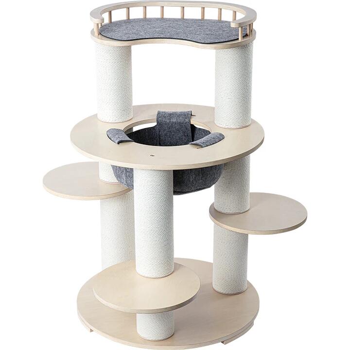 HONEYPOTCAT Harmony Wood Cat Tower is a large, multi-layer wood structure that combines a cat bed and cat tree into one. Its unique design and comprehensive functionality cater to various needs of cats. The multi-level layout provides ample space for cats to climb, rest, and play, making it suitable for cats of different sizes and personalities. With a design that is versatile for all seasons, it ensures that cats can enjoy a comfortable environment year-round. This makes it an ideal activity area in the home, allowing cats to express their natural behaviors and enjoy their time to the fullest.