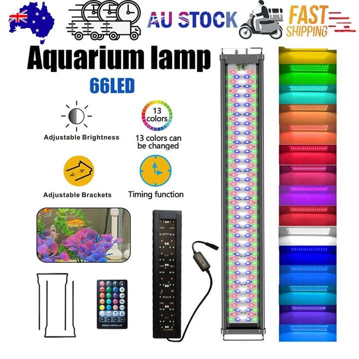 40cm Aquarium Housing 66LED RGBW 15W Waterproof Stand Light Full Spectrum 13 Colors with 2 Adjustable Stand 1 Timer Controller for 40-60 cm Aqua Fish Tank? 66LED RGBW 13 Colors: Full Spectrum Lighting is more suitable for Freshwater and Saltwater aquatic plants;?Adjustable bracket at both ends: Extendable Adjustable bracket makes LED light fits different size aquariums in extendable range;?Independent LED light: If one of the LEDs is not working by being misused, the others would not be affected (But other cheaper ones will be extinguished lots of LEDs and can’t be used any more);?Energy saving and durability: High efficiency, low energy dissipation, save cost, extend LEDs life span, much durable than those lights made of plastic;?Recommend 40-60 cm Fish Tank: Please choose light with suitable length for your nano tank to achieve good effect, Full Spectrum Lighting is more suitable for Freshwater and Saltwater aquatic plants.13 Color Light Specifics:The Five Generation of RGBW Aquarium LightsUltra Bright 2835 RGB LEDHigh Quality Color Changing RGB LEDINPUT:DC5-24VOUTPUT:DC5-24VOUTPUT CURRET:MAX 6AFull Spectrum Lighting is more suitable for Freshwater and Saltwater aquatic plants.Four timing modes of 3/6/9/12hours:For exampleAt 10:00am today, timing 3 hours, the light will turn off after 1:00pmAt 10:00am tomorrow, the light turn on and work 3hours,will turn off after1:00pm,Continuous circulation(Note that power cannot be cut off during timing)Package Includes :1 x 40cm Aquarium Light2 x Extendable Brackets1 x DC 12V Power Adapter1 x User ManualNOTE:PO BOX address is not supported, please provide the correct physical addressATTENTION:If the customer change their mind and want to cancel the order, please contact us within 2-3 hours after placing the order. Or, once the package is dispatched, we wont be able to intercept packages in transit. Please understand.Refund note: Only return the product cost, not refund the freight!!!Tip:Due to the high freight costs in some areas, there may be additional charges. Thank you for your understanding.