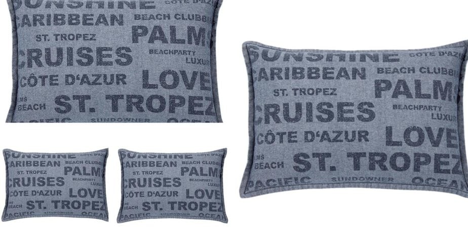 Select the right cushion covers and throws to decorate your home, either with contemporary, funky, retro or modern designs. Add texture, colour, size and shape to give your home an individual and hand selected designer look. These can be used in lounge rooms, bedrooms, caravans, a man cave, and kid’s bedrooms or anywhere you want to add some style. Even great as gifts for birthdays and Christmas.Features:Description: Pack of 4 Denim Sunshine cushion coversShape: RectangleStyle: beach, nautical, fresh, wording theme. cruises, Caribbean, love etc.Colour: denim blue.Material: CottonSize: 40cm x 60cmClosure: ZipperUses: Lounge, chair, bed, caravan, boats or scatter cushion coverProduct may vary from batch to batch and any variations are to be accepted as part of the materials and manufacturing process. Images of goods may vary in Colour depending on the viewing device and pixels etc. Colours will vary from the internet to real life.