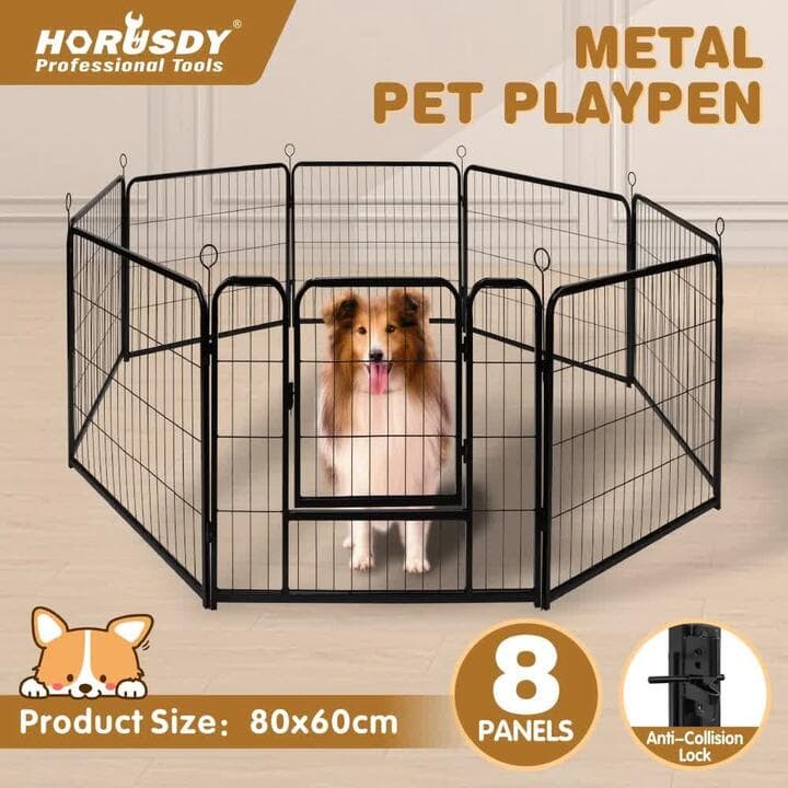 Supper easy to assemble:It wont take you more than 5 minutes to assemble these portable dog fences as well as pack them away due to the rod-connected design. Meanwhile, panels can be added or removed freely to give you a fully flexible area and arrange the dog pen in any shape you need.Multi-scenario use:The dog playpen features a powder coating that will help protect against rust and extend its life, which makes it ideal for RV camping, traveling, or for use in the yard. When used indoors, we recommend placing it on a dog pad or carpet to prevent the rods from scratching the floor, or please try our new floor protectors or dog pee pad for the same purpose.Unlock your freedom, savor the moment:The rods are easily inserted into the ground for greater stability and rigidity, which won’t collapse when the dog leans against them. Also, the automatic gravity-actioned locking mechanism will ensure you can open and close the door smoothly and reduces the chance of dogs unlocking by themselves. All of this is designed for absolute safety, so you can really relax.Safe Sturdy Build:No sharp edges and strong construction prevent injuries and withstand jumping.Package Includes:1x 24inch Dog Playpen Set