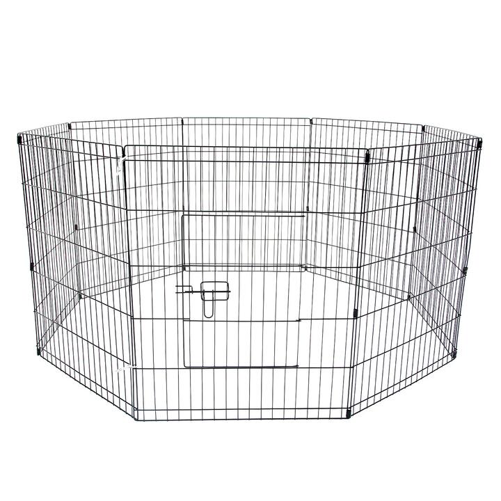 Paw Mate Pet Playpen 8 Panel 36in Foldable Dog Exercise Enclosure Fence Cage For those Pet owners not able to let their pets running around of the house, the Paw Mate pet playpen will solve your problem.It features as 8 panels for multi-configuration which allows you to turn your playpen into different shapes. Made of durable steel frames construction with black powder coat finish provides Long Lasting Protection and weather resistance. The access door with bolt latches you can be sure that your pet doesn’t have the opportunity to run away and the round edges ensure pet safety.This pen is ideal for small pets such as puppies, kittens, guinea pigs and rabbits, and it is suitable for both indoor / Outdoor.Product Features:Multi-configuration with 8 PanelsDurable steel frames with black powder coated finish provides Long Lasting Protection and weather resistanceRound edges design safer for your puppyBolt Latches for easy to open the doorAccess Door’s Lock with Secure Lock system which can be only unlocked when it facing upwardFoldable for convenient storage and transportationQuick set up without tools needed, setup up / fold up in 20 secondSuitable for a variety of pets such as puppies, kittens, guinea pigs and rabbitsSGS Approved ensured safety for your petProduct Included:Pet PlaypenProduct Specification:Brand: Paw MateColour: BlackMaterial: Steel FrameFinishing: Powder CoatedPanel Dimension: 24in(61cm)(W) x 36in(91cm)(H)Playpen dimension: 155cm(W) x 91cm(H)Access Door dimension: 29cm(W) x 43cm(H)Bar distance: 3.5cmWeight: 10kg
