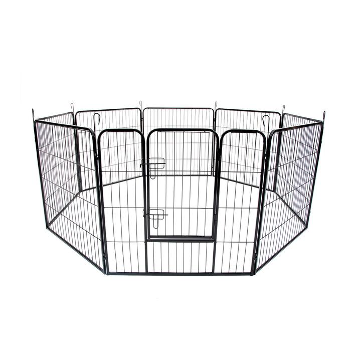 Paw Mate Pet Playpen Heavy Duty 32in 8 Panel Foldable Dog Exercise Enclosure Fence CageThis Paw Mate Extra Heavy Duty 32in Playpen is the best choice for owners wanting their pet to exercise without the need to worry about them scaping, getting lost and/or going after other people!It is a multi-configuration playpen with 8 panels which allows you to turn your playpen into different shapes. The playpen is made of durable extra heavy duty steel frames construction with black powder coat finish. This fine finish provides long lasting protection and weather resistance. The access door has bolt latches and this ensures that your pet doesn’t have the opportunity to run away and the round edges ensure pet safety.The playpen can also be extended and by this you can use it as a fence, so you can block your door or pathway. If you extend all the panels, the maximum length is up to 6.40m! Please note that you will need something such as bricks or posts to hold the playpen upright. These are NOT included in this package.It is SGS Approved to ensured the safety of your pet.This pen is ideal for small pets such as puppies, kittens, guinea pigs and rabbits, and it is suitable for both indoor / Outdoor.Product Features:Multi-configuration with 8 PanelsSuper strong steel framesDurable powder coated extra heavy duty steel frames finish provides Long Lasting Protection and weather resistanceRound edges design for added safety to your puppyBolt Latches for easy to open the doorAccess Door has a Secure Lock system which can be only unlocked when facing upwardFoldable for convenient storage and transportationQuick set up, no tools needed, setup up / fold up in minSuitable for a variety of pets such as puppies, kittens, guinea pigs and rabbitsSGS Approved to ensure the safety of your petProduct Included:1x Super Strong Steel Frame Pet PlaypenProduct Specification:Brand: Paw MateColour: BlackMaterial: Heavy Duty Steel FrameFinishing: Powder CoatedPanel Dimension: 32in(80cm)(W) x 32in(80cm)(H)Playpen dimension: VariesAccess Door dimension: 56cm(W) x 34cm(H)Bar distance: 4cmWeight: 18.5kg