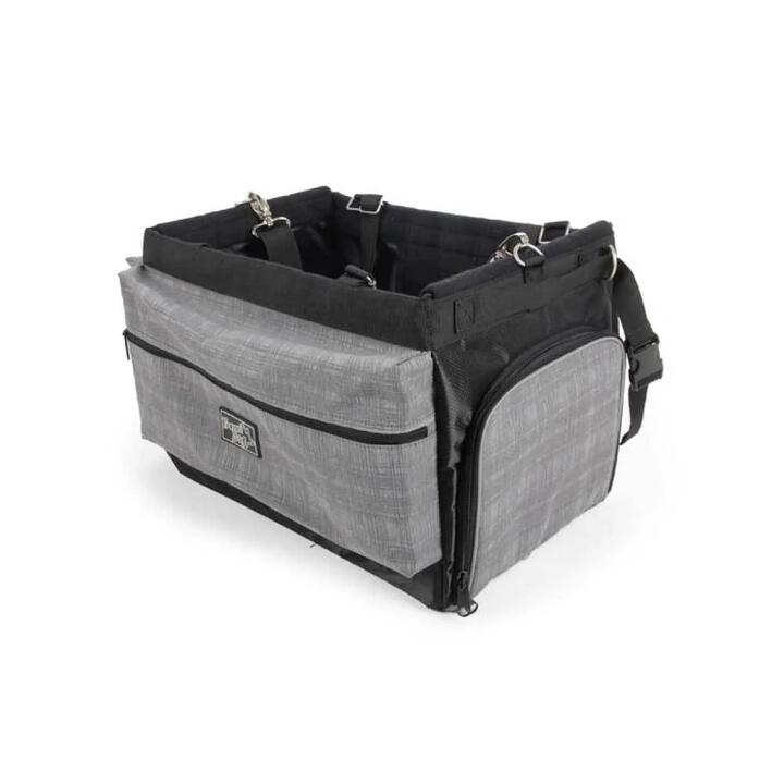 All For Paws Travel Dog Deluxe Bicycle Bag 2 in 1 carrier, front mounted.The Deluxe Bicycle Basket allows you to mount your pet at the front of your bike, and enjoy riding down the road in style and comfort. Easy and fast to attache to all handlebars with its quick release lock device. It also doubles as a carry bag for your pet.Features:Suitable for small dogsCan be use as a bagMultiple pockets to arrange dog suppliesEasily attaches to bike handle barAdjustable strapsFolds flat for easy storageAir vents to keep pet cool, and allows for drainageReflective stripes all around for low-light safetyPadded comfy interiorSpecifications:Outer Dimensions (cm) : 34 (L) x 25 (W) x 27(H) (Please note that these are the external dimensions of the basket)Inner Dimensions (cm):32 (L) x 23 (W) x 24 (H)Colour: Grey and BlackWeight: Up to 8kg / 18 lbsNote: Please refer to measurements as this bag is suitable for a small sized pet.The outer dimensions of the product measures the whole length and width, including storage pockets.Package Includes:AFP Dog Bicycle Mount Bag.
